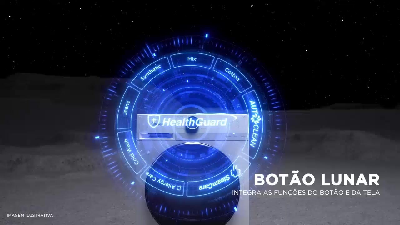 - Botão lunar :integra as funções do botão e da tela, oferecendo uma experiência única na sua lavanderia